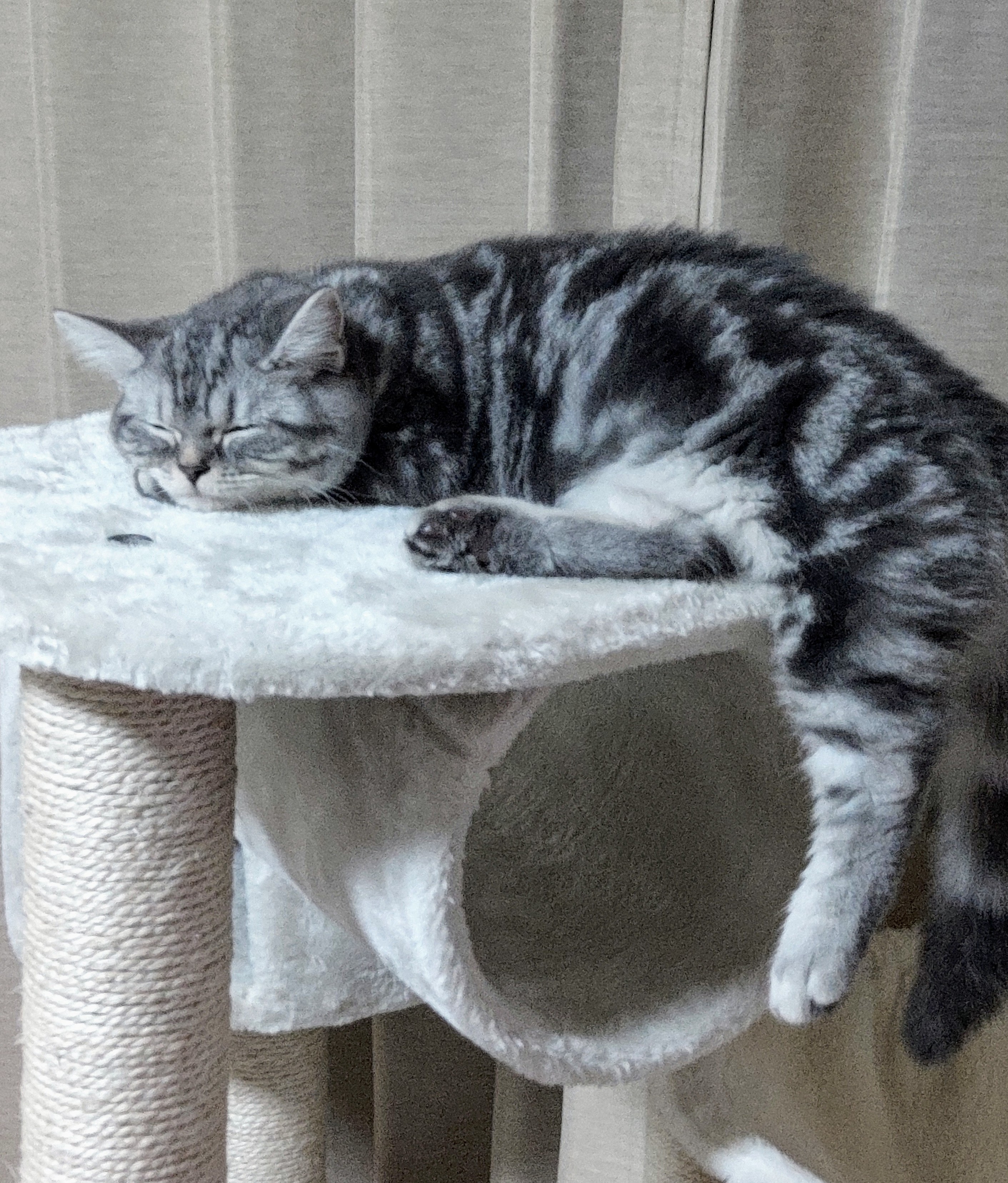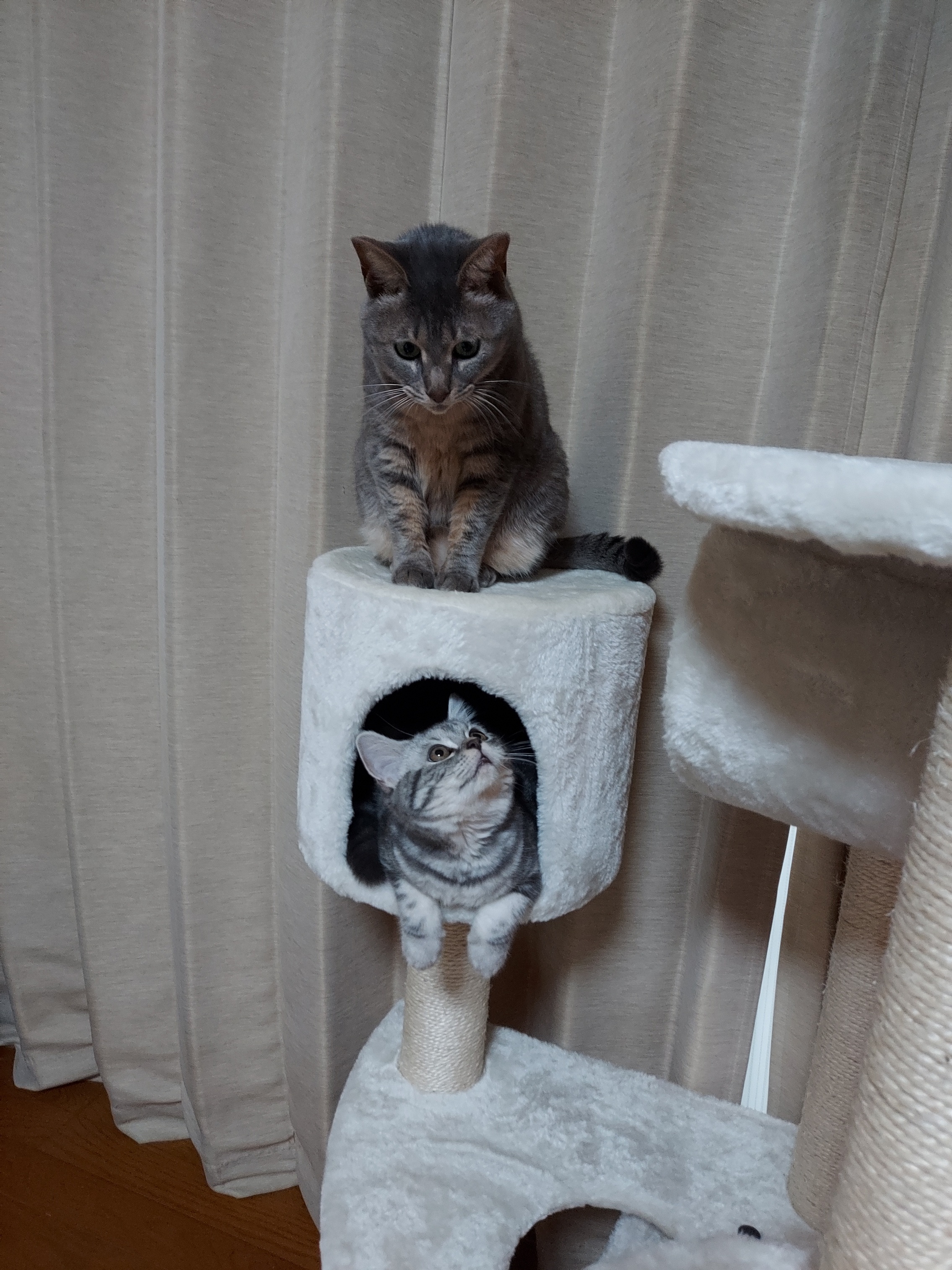 3週間 日記 2021年10月13日 おむつ姿で失礼します。長老の現在のお姿。22歳4ヶ月。もうほぼ見えないから目が合わない。目線下さーい!子猫が来てから約3週間。長老への被害が少ないことからドア開放して自由にさせています。子猫→長老にちょっかい出さない。7歳→長老への無駄な絡みがほぼなくなり子猫に興味津々。思ったより、というか理想の形で進んでいてホッとしてます。今のところは…。子猫がとにかく元気なので キャットタワー(中)を買いました。天井まであるタイプは圧迫感があって嫌なので(私がw)高さ120センチぐらいのやつ。しかしいざ設置してみると幅的に圧迫感があって、どっちもどっちかもしれないw 気に入ってくれたようでさっそくスヤァ…。7歳も使ってくれてるので買って良かった。