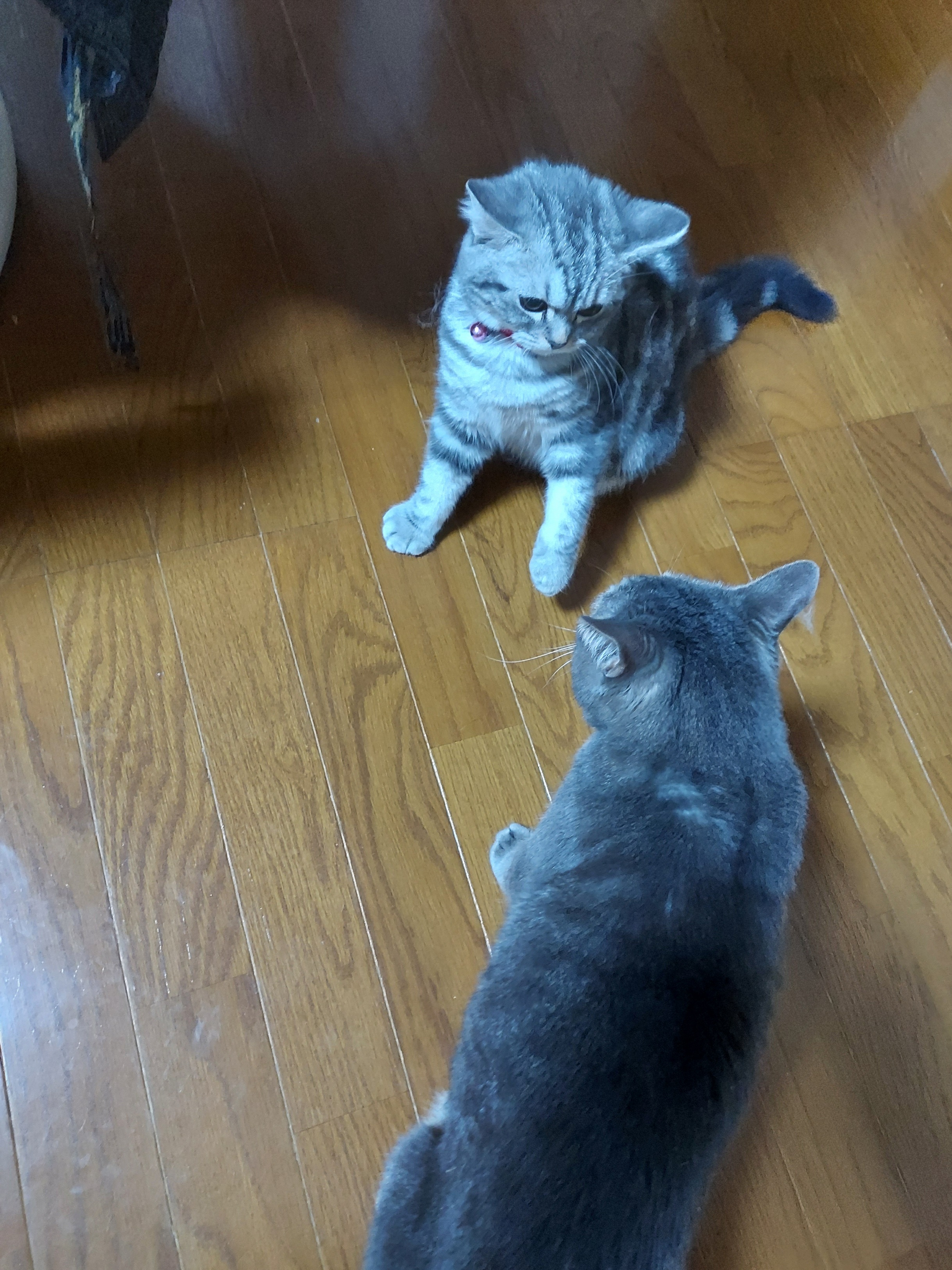 猫は単独を好むらしいけど 日記 2021年10月06日 ↑ 子猫をじーっと見つめる7歳。ちょっと顔こわい。子猫が家に来てから約2週間。居間に人がいる時間だけドア開放して自由にさせています。とにかく落ち着きのない子猫を「なんだあいつ…」みたいな顔で見つめる7歳。最初のうちは子猫を威嚇してた7歳だけど、徐々に慣れてきた模様。一応、鼻と鼻をチョンとくっつける挨拶はしてた。追ったり追われたりの追いかけっこもしてた。まだじゃれあって遊ぶわけじゃないけどそこそこやっていけそうだと思ったので、早々に子猫の引き取りを決めました。22歳長老は、なんかうるさいのがいるな…みたいな感じで不機嫌です。なるべく静かな余生を送らせてやりたかったのだがすまんな…。念入りにブラッシングしたり長く撫でたりして機嫌を取るわたし笑。いつも7歳にちょっかい出されてフーッって怒ってるから、それが少し減れば…という思惑もあったのだけどどうだろう。今のところ子猫は長老にビビッてあまり近づかないのだけど、これが慣れてきて長老への干渉が半減どころかよもや2倍になる事態になったら、ドア完全開放は出来ないなあ。